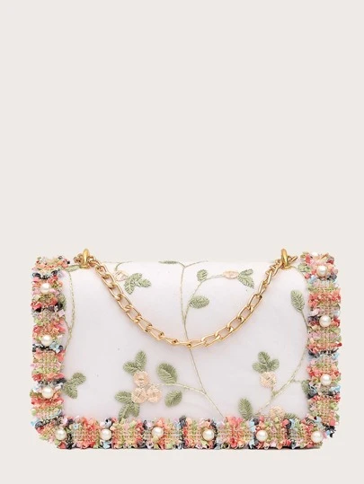 Mini Floral Embroidery Chain Shoulder Bag - White - View 1