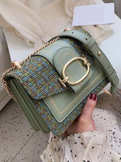 Mini Plaid Patterned Small Tweed Bag, Ornamented Square Shoulder Bag, Chain Crossbody Flap Purse, Suitable For Everyday Use - Green - View 1