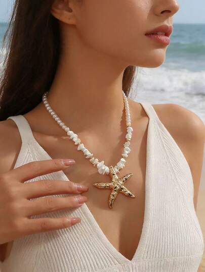 Minimalist Casual Starfish & Shell Beaded Necklace, Faux Pearl, Fashion Accessory Suitable For Women's Daily, Festival, Party, Commute Wear - Multicolor - View 1