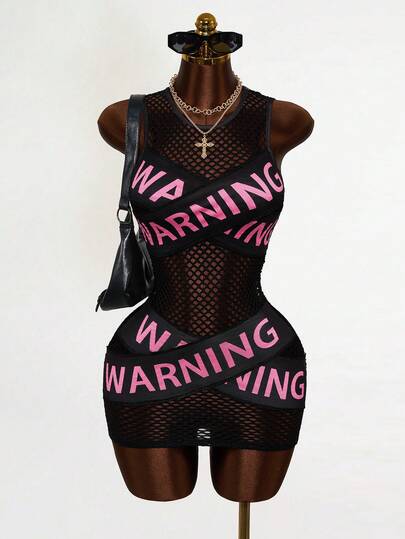 Mistrie New Women's Mini Dress That Is Tight And Slimming, With Printed Mesh And Slogan Graphics, Street Photography, Music Festival Parties - Black - View 1