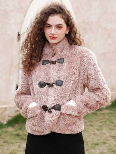 Mock Neck Duffle Teddy Coat - Dusty Pink - View 1