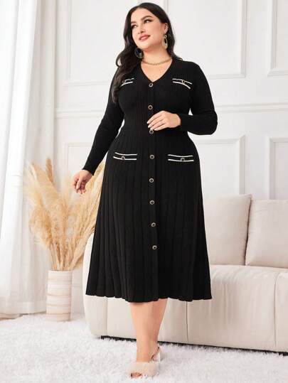 Modelyn Plus Button Front Single Breasted Ribbed Knit Sweater Dress, For Winter Fall Cloth For Women - Black and White - View 1