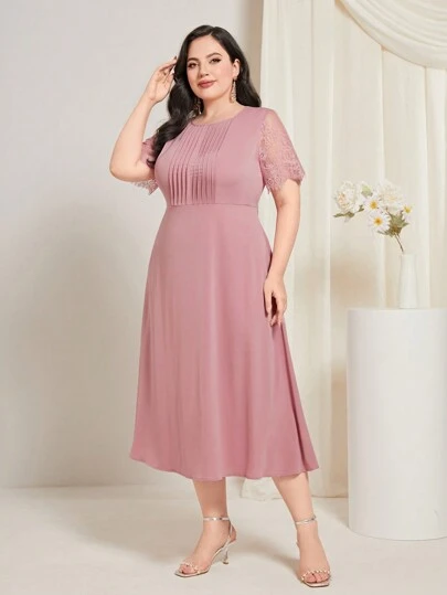 Modelyn Plus Contrast Lace Pleated Detail Dress - Pink - View 1
