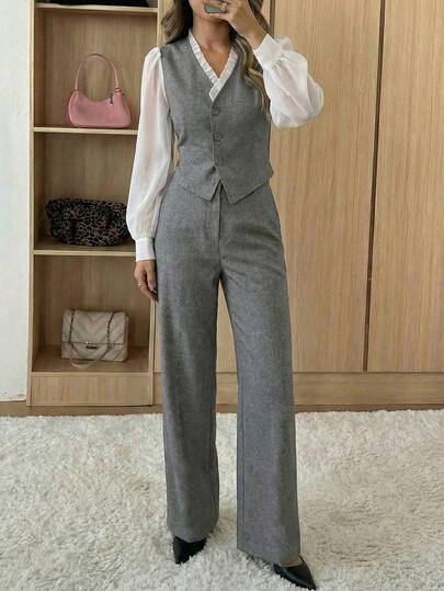 Modelyn Women's Gray Double-Sided Chiffon Ruffle Waist Elegant Blouse And Straight Leg Pants 2 Pieces Set - Grey - View 1