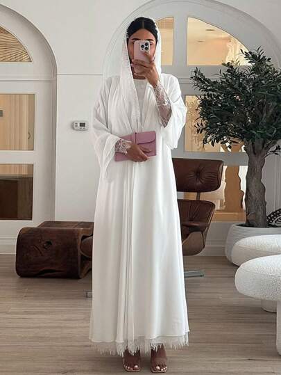 Modest Middle Eastern Style Muslim Women Clothing With Headscarf, Chiffon & Contrast Lace Abaya Dress - White - View 1