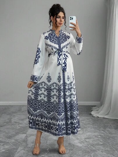 Momance Elegant V-Neck Women's Printed Long Sleeve Tie Waist Dress - Blue - View 1