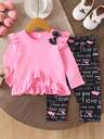 Baby Girls' Fashionable Minimalist Cute Square Neck Bowknot Bodysuit With Heart Shaped Print, Ruffled Edges, Headband, Spring/Summer