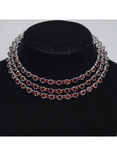 Multilayer Rhinestone Exaggerated Big Collar Necklace, 3Layers Crystal Adjustable Necklace Choker Accessory For Women - Silver Dark Red - View 1