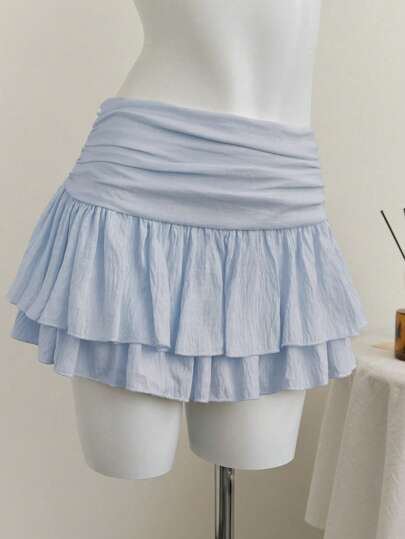 Elamini Beige Vacation Style Pleated Loose Waist Double Layer Chiffon Short Skirt - Baby Blue - View 1