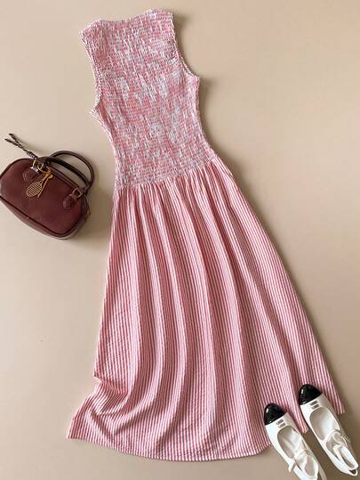 Muvela Spring/Summer New Arrival Pink & White Striped Round Neck Sleeveless Shirred Elastic Waist Flared Hem Dress, Elegant Carnival Party Chic Urban Commute Workwear - Baby Blue - View 1