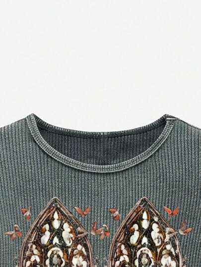 NEON BLANC Men's Crew Neck Ribbed Letter & Butterfly Print Casual Everyday Long Sleeve T-Shirt - Dark Green - View 1