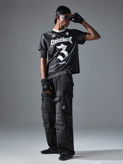 NEON BLANC Men's Streetwear Knit Short Sleeve Crew Neck T-Shirt With Letter & Number Embroidery, Graphic Print - Black - View 5