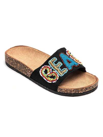 Platform Sandal With Decorative Pearl Embroidery Strap - Black - View 1