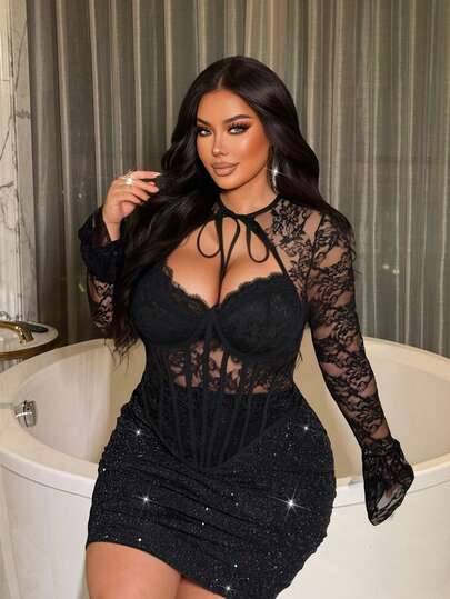 NU&NOW Women's Romantic, High-End, Casual, Young, Fashionable, Luxurious Black Lace, Sexy, Knitted, Elastic, Waist-Slimming, Long Sleeve, Minimalist, Commuting, Daily Versatile Blouse, Suitable For Spring, Autumn And Winter - Black - View 1