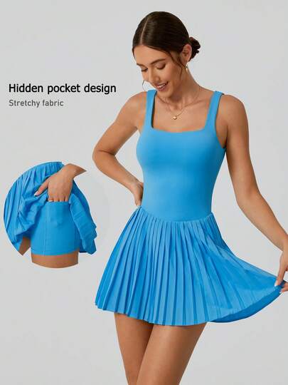 NcmRyu 1 Set Women's Fashion Anti-Flashing Safety Shorts With Waist Cinching, Hollow-Out Back, And Pleated Skirt Hem Athletic Dress - Lake Blue - View 1