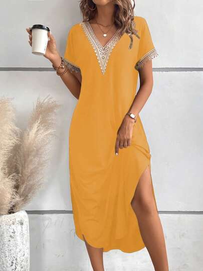 SHEIN LUNE Guipure Lace Panel Split Thigh Tee Dress Maxi Women Outfit - Yellow - View 1