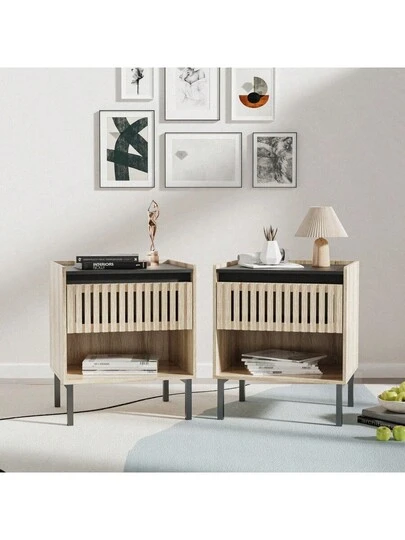 Bedside Table Set 2, 2024 Year - Natural+Black+MDF+Iron+Bedroom+1 Drawer+Bedside Cabinet as Pic - View 1