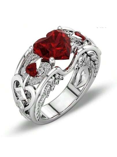 New Arrival Korean Fashion Jewelry, Women's Accessories, Creative Rings, Mother's Day Father's Day Themed Jewelry, European & American Princess Red Ruby Heart Rings, Gift Jewelry - Silver - View 1