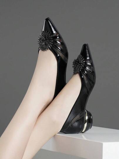 Fall/Winter 2025 Women's Thick Heeled Pointed Toe Pumps With Flower & Rhinestone Mesh Decor, Mid Heel, Elegant - Black - View 1