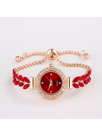 New Casual Fashion Women's Bracelet Watch, Cute Rhinestone-Encrusted Small Round Dial, Leaf & Feather Design Band, Alloy Quartz Watch Gift - Red - View 1