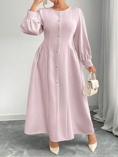 Elenzga New Fashion Simple Round Neck Faux Front Long Sleeve Dress For Women - Pink - View 1