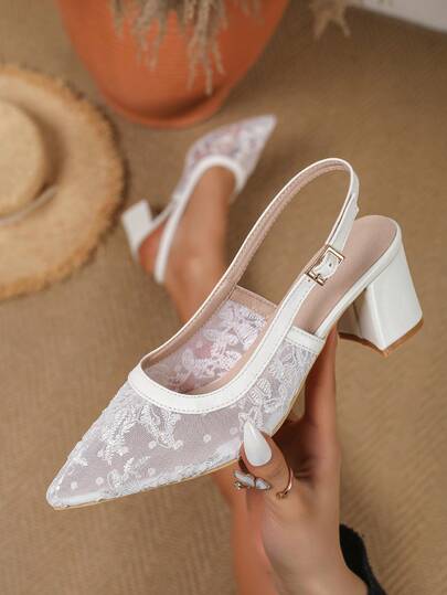 New Fashion Women's Pointed Toe Valentine's Day High Heel Shoes, Chunky Heel White Backstrap Casual Comfortable Shoes - White - View 1