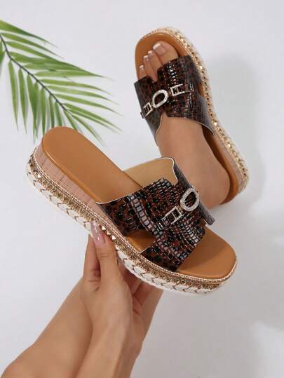 New Fashionable Animal Texture One-Buckle Chain Strap Beach Sandals, Women's Square Toe Platform Rivet-Embellished Composite Sole, Outdoor Summer - Coffee Brown - View 1