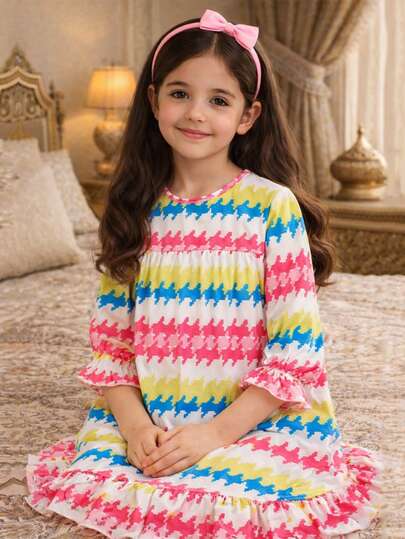 New Girls Nightgown, Casual Comfortable Sweet Colorful Striped Children Ramadan Nightgown, Ruffle Collar Long Girls Sleepwear - White - View 1