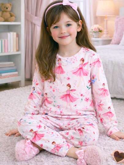 New Girls Pajama Set, Cute Floral Fairy Cartoon Print Children Sleepwear Set, Round Neck Long Sleeve Homewear, 2pcs, Suitable For All Seasons - Pink - View 1