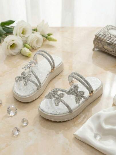 New Girls' Summer Thick Sole Fashion Slippers, Butterfly Strap With Rhinestones, Slip-On Round Toe Beige Thick Sole Shoes, Suitable For Vacation And Home Wear - Beige - View 1