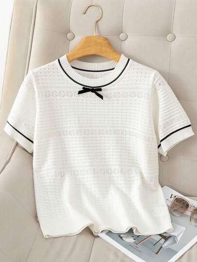 New Hollow Out Knitted Short Sleeve Top, Delicate Design, Youthful Style, Summer - White - View 4