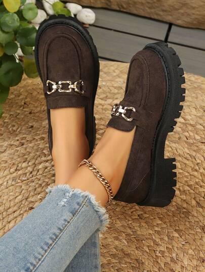 New Plus Size Casual Thick-Soled Retro Style Mature Elegant Elegant Versatile Slip-On Women Shoes, Solid Color Low Vamp Slip-On Metal Chain Fashion Comfortable Personalized Eye-Catching Classic Casual Everyday Commute Vacation Wear Suede Coffee Brown Platform Loafers - Coffee Brown - View 1