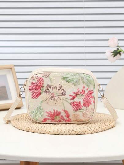 New Sequin Embroidered Women's Camera Bag, Shiny Sequins Crossbody Bag, Fashionable PU High-Quality Handbag, Suitable For Ladies, College Students, Young Women, Work, Party, Holiday Gift, Elegant, Suitable For Various Occasions, Adjustable Strap Length - White - View 1