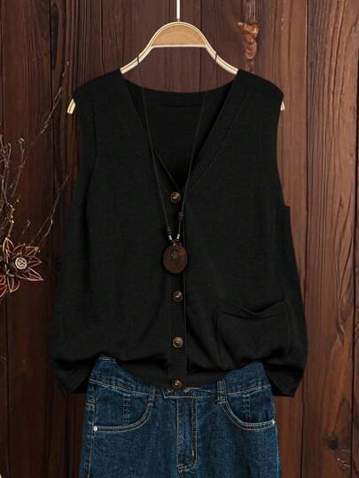 EMERY ROSE New Women's Versatile Simple Single-Breasted Casual Knitted Vest - Black - View 1