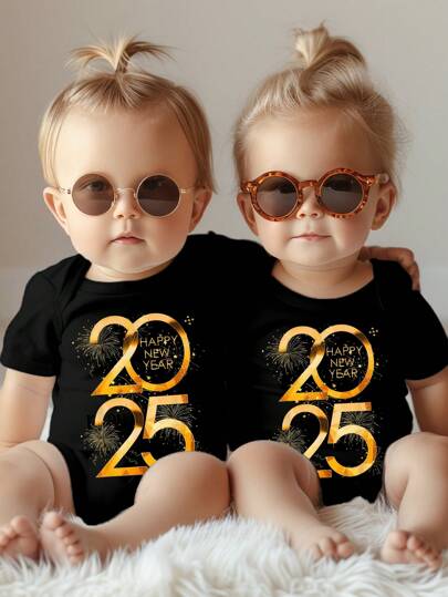 New Year Baby Girls Letter Slogan Graphic Print Short Sleeve Bodysuit, New Year Gift, Family Matching Outfits - Mommy And Me (4 Pieces Sold Separately) - Black - View 1