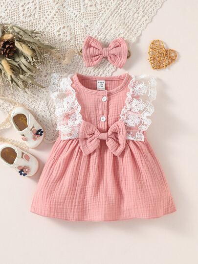 SHEIN Newborn Baby Contrast Lace Ruffle Trim Bow Front Dress With Accessory Headband - Coral Pink - View 1