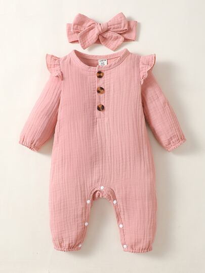Newborn Baby Ruffle Trim Jumpsuit & Headband - Dusty Pink - View 1