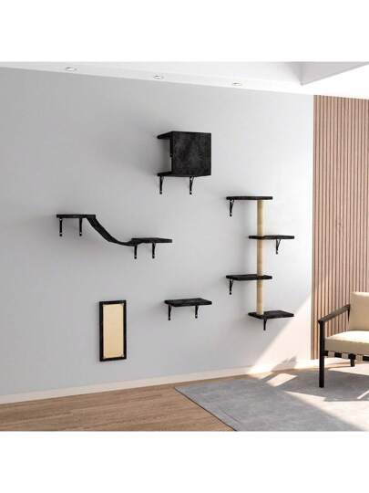 Cat Tree Wall Mounted Furniture DIY Set Climbing Shelves For Kitty Play & Relaxing - Includs Scratching Board, Connect Bridge, House And Scratching Posts - Black - View 1