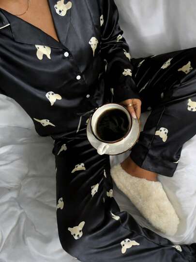 Nina Bonheur 2pcs Women Loose Button Dog Print Long Sleeve Cardigan + Elastic Waist Pants Pajama Set - Black - View 1