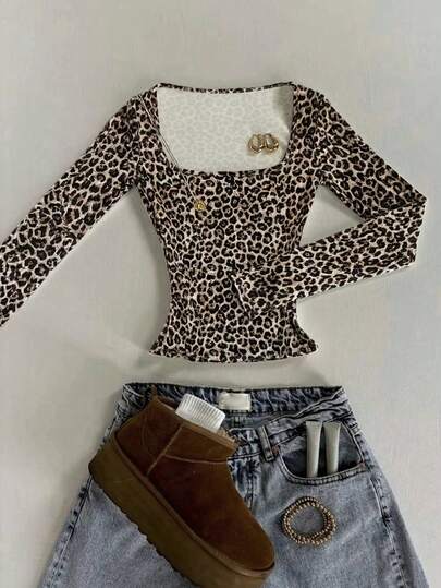 Noixe Classic Black And Light Brown Leopard Print, Fashion Square Neck Slim Long Sleeve T-Shirt, Animal Print, Suitable For The Four Seasons, Fashion T-Shirt, Fashion T-Shirt, Brother Sisters Gift, Sisters Gift, Mother's Day Gift, Fashion Shirt - Multicolor - View 1