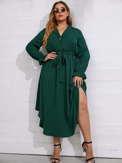 SHEIN LUNE Plus Flounce Sleeve Curved Hem Belted Dress - Dark Green - View 1