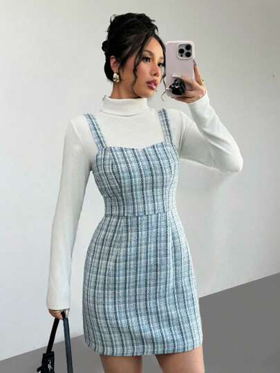 Chiquease Plaid Print Thick Strap Warm Elegant Vintage Sleeveless Dress Mini Short Women Outfit - Blue - View 1