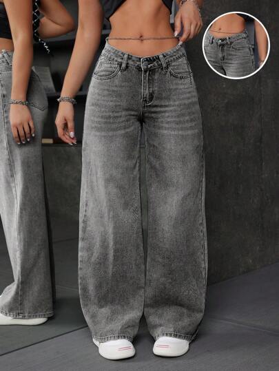 SHEIN ICON Women's Loose Fit Wide Leg Low Waist Denim Jeans With Pockets - Grey - View 1