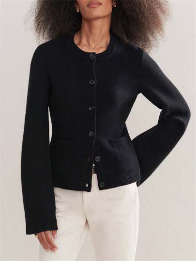 Women's Solid Color Cardigan Long Sleeve Crew Neck Button Down Sweater Knit Tops With Pockets Fall Fashion For Women - Black - View 1