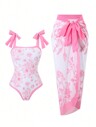 European & American Style Floral Print One-Piece Conservative Tummy Control Swimsuit With Cover-Up Skirt For Holiday, Spa, Swimming, For Summer Vacation