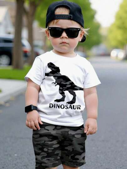 SHEIN DINO, DINOSAURS, STREETSTYLE, Kids' Choice Collection, Everyday Basic, Happy Kids, Pastel Colors For Kids, Bikercore, Family Trip, Happy Days, I Love Mommy, I Love Daddy, Lovely Home, Cool Kids, Baby Boy 2pcs Set Casual Round Neck Short Sleeve Shorts, Suitable For Summer Dinosaur Baby Boy Clothes Baby Boy Summer Outfit Dinosaur Outfit For Toddlers Baby Boy Camo Shorts Boys Dinosaur Shirt - Multicolor - View 1