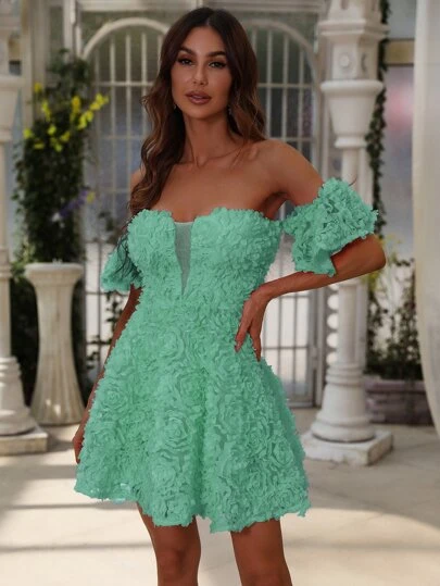Off Shoulder Mesh Insert Dress - Green - View 1