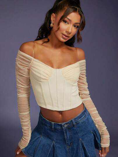 Hauture Off Shoulder Ruched Mesh Long Sleeve Crop Top - Apricot - View 1