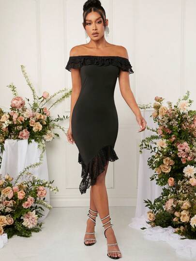 L'Amorae Off Shoulder Ruffle Lace Trim Dress - Black - View 1