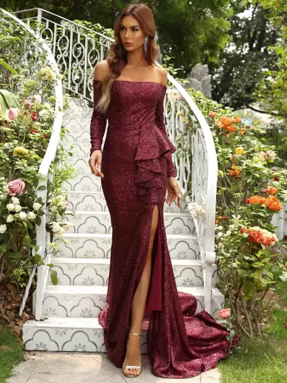 Missord Off Shoulder Zip Back Draped Split Thigh Mermaid Hem Prom Dress - Maroon - View 1